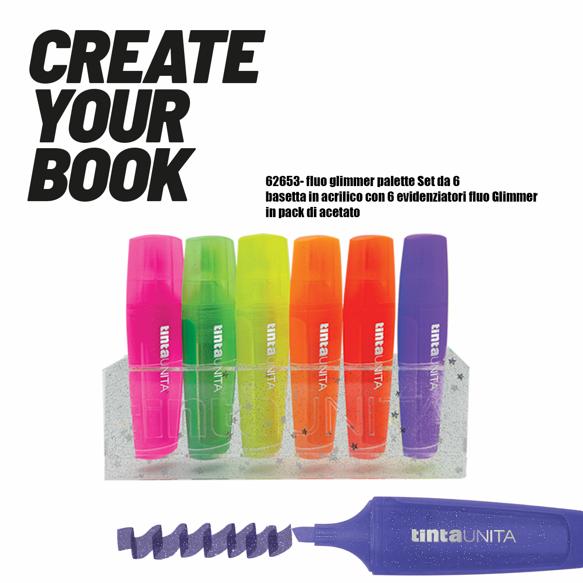 n. 6 evidenziatori fluo glimmer tinta unita su basetta in aclrilico