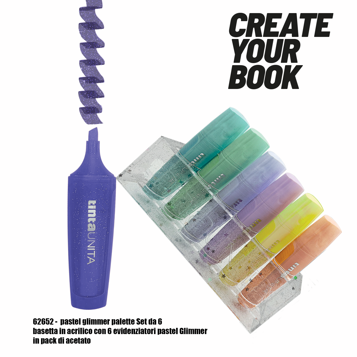n. 6 evidenziatori color pastello glimmer tinta unita su basetta in acrilico