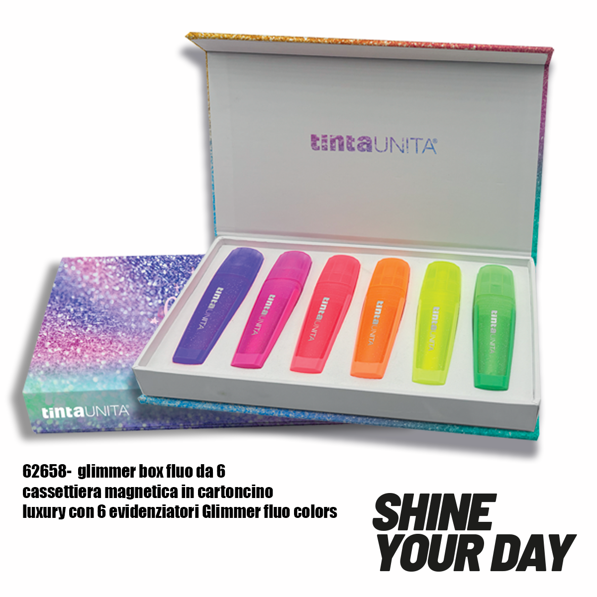 Evidenziatori glitterati fluo tintaunita in cassettiera magnetica n.12