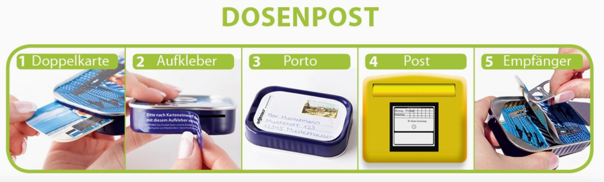 POSTA IN SCATOLA Saluti e regali in denaro in una scatola di latta di pesce non preoccuparti, non puzza di pesce È COSÌ CHE FUNZIONA Puoi consegnare questa fantastica scatola di latta di persona o inviarla per posta. Ecco come funziona: • Scrivi i saluti sul biglietto di auguri • Far scorrere questa carta e il regalo desiderato di denaro/buono/biglietto ecc. attraverso la fessura laterale nella lattina di pesce e sigillare con l'adesivo in dotazione. FATTO! • Per la spedizione, compilare l'etichetta con l'indirizzo allegato e attaccare sul retro della lattina. Affrancatura grande e via nella cassetta delle lettere.